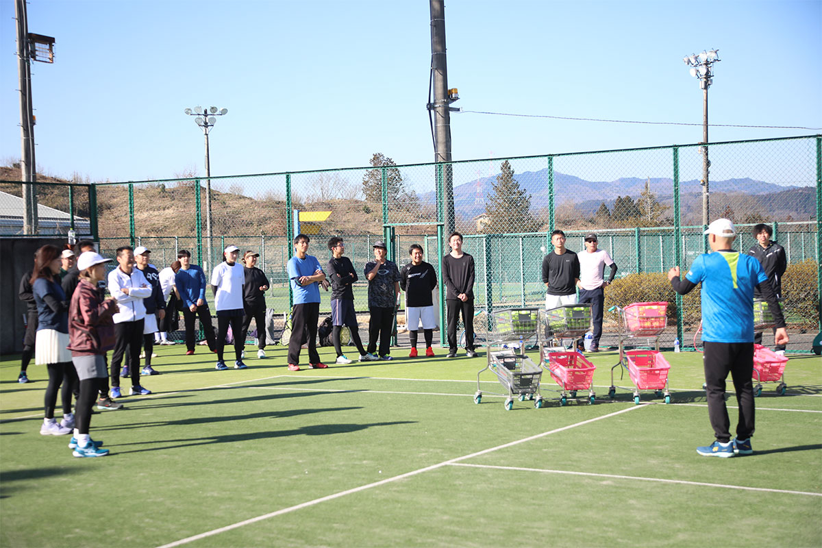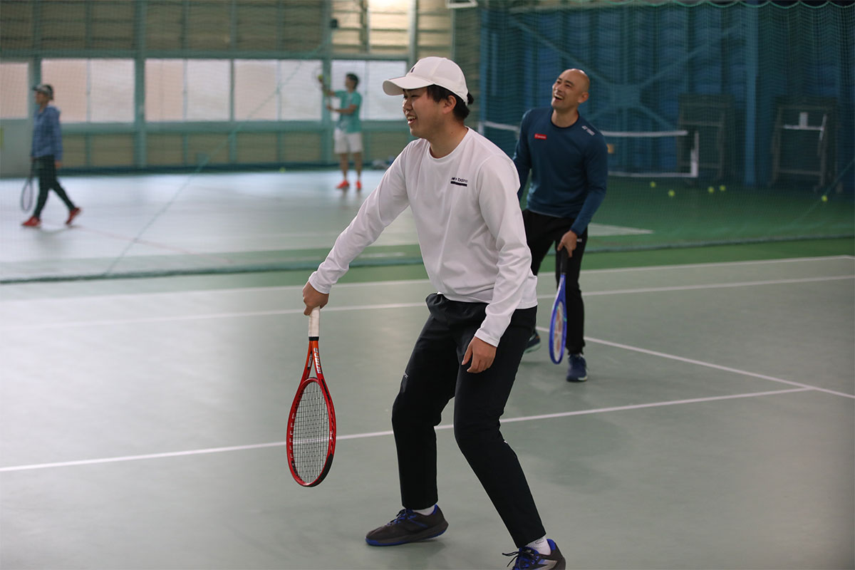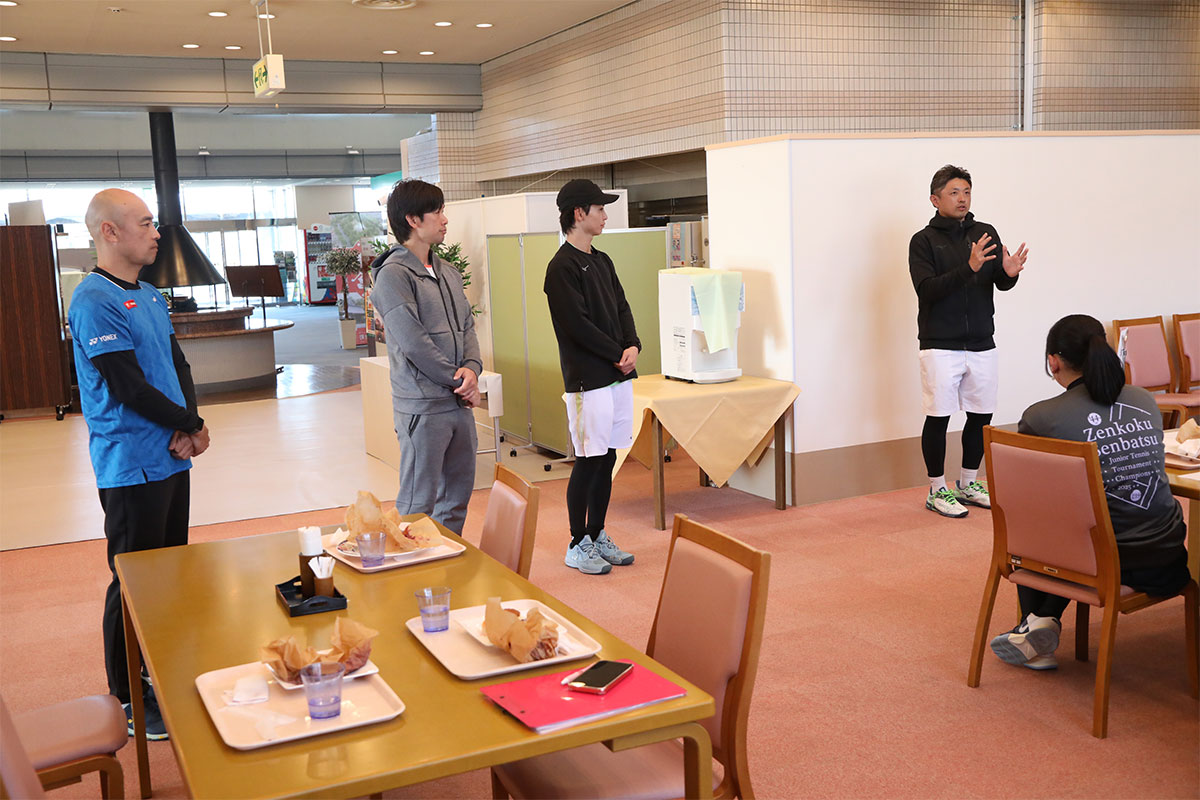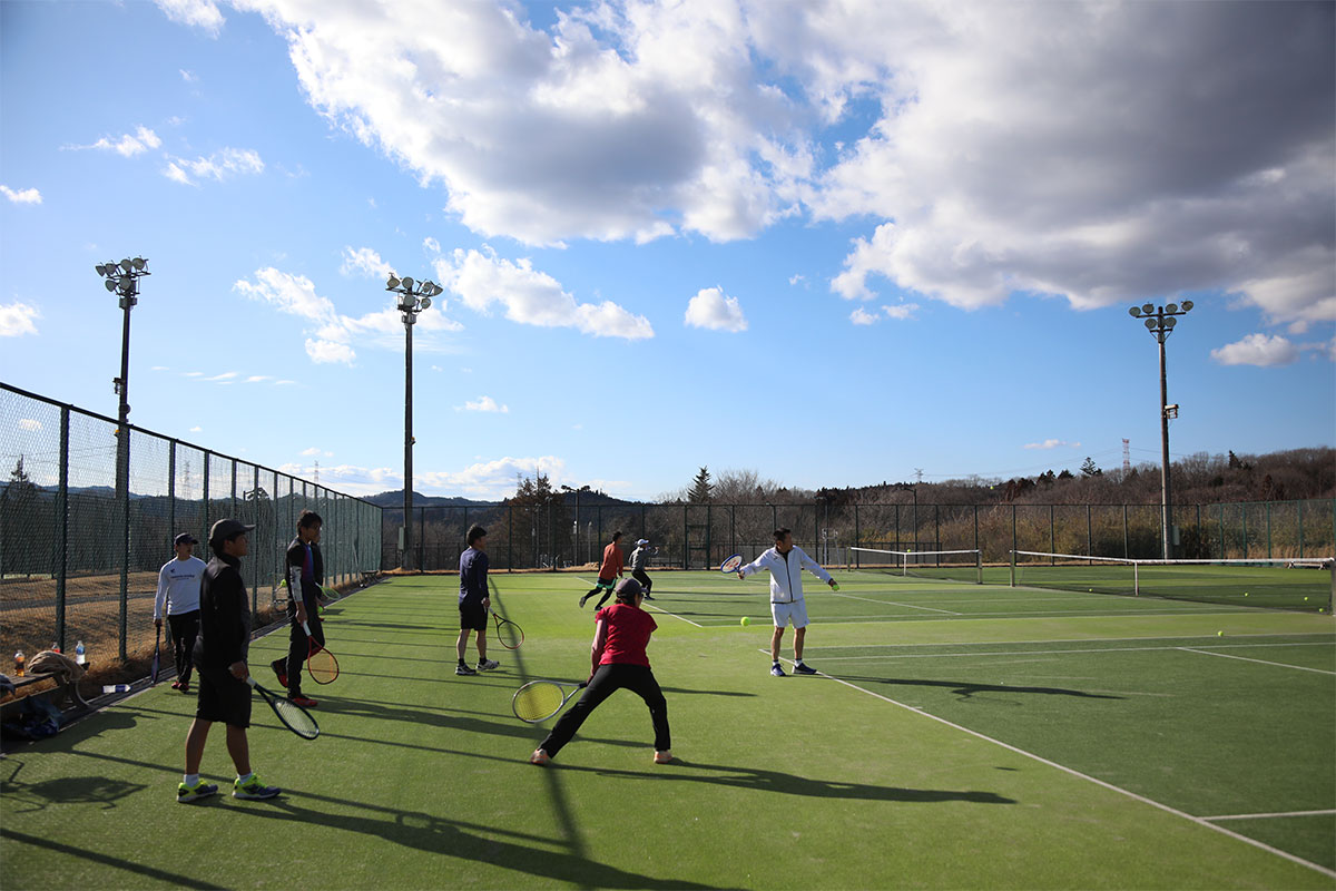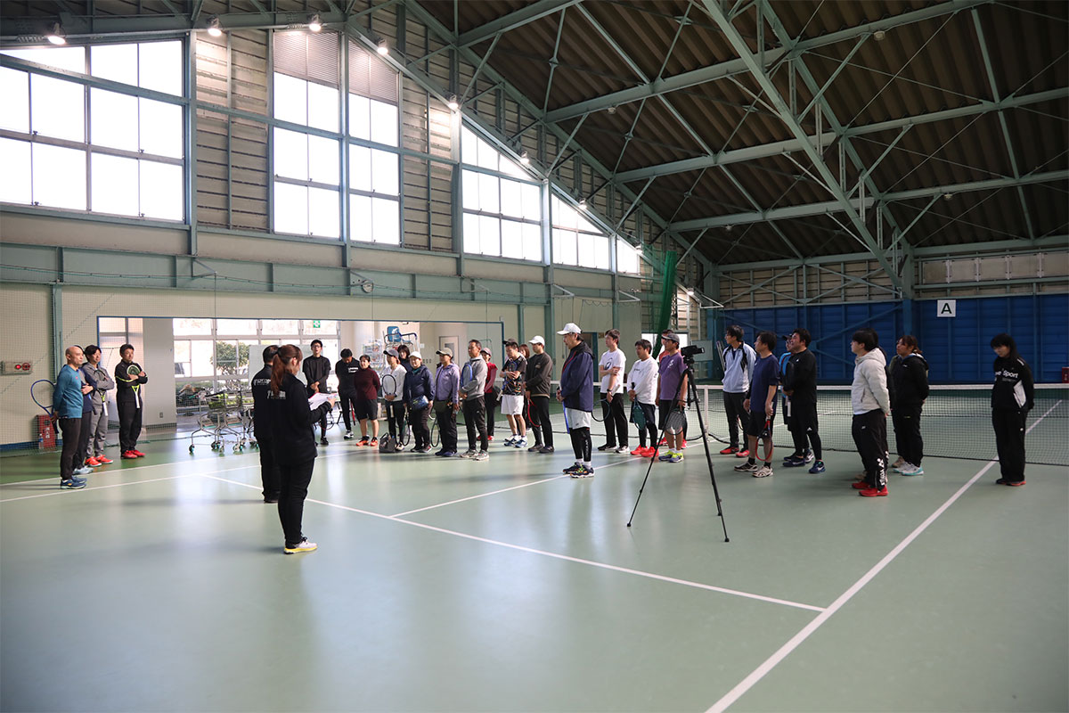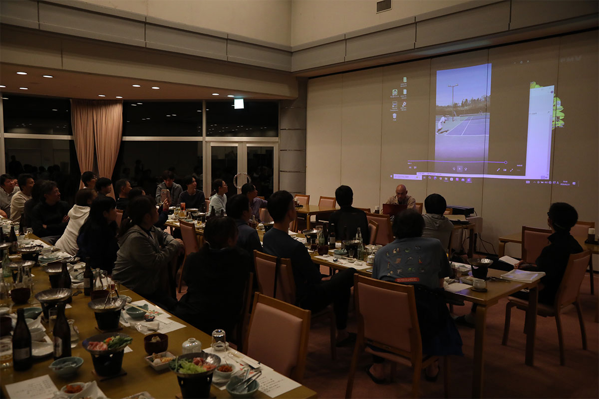 岩渕プロと交流をしながら、オンコートでのレッスンからビデオ映像を使用した座学講習までテニスのスキルアップに取り組みました。