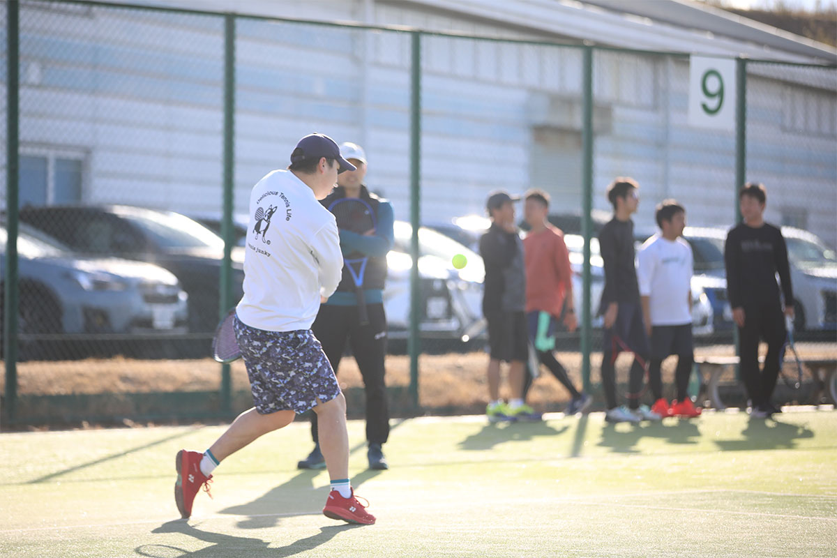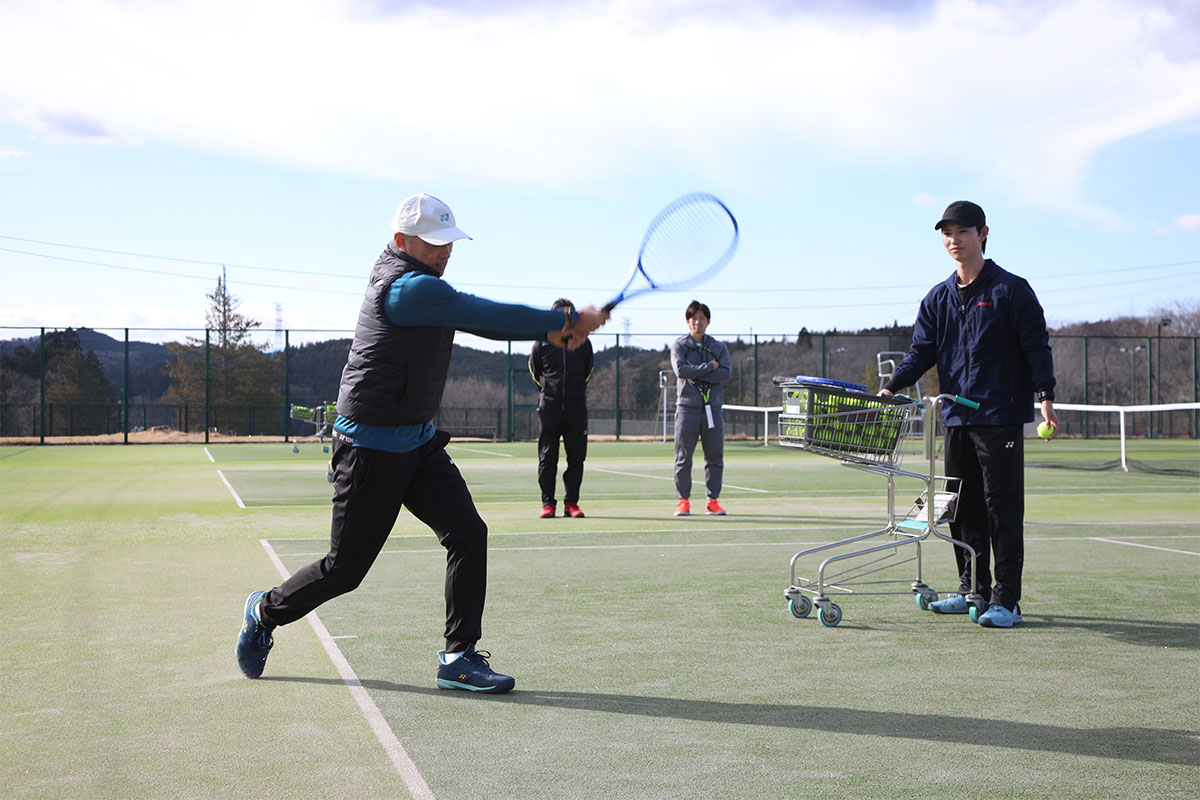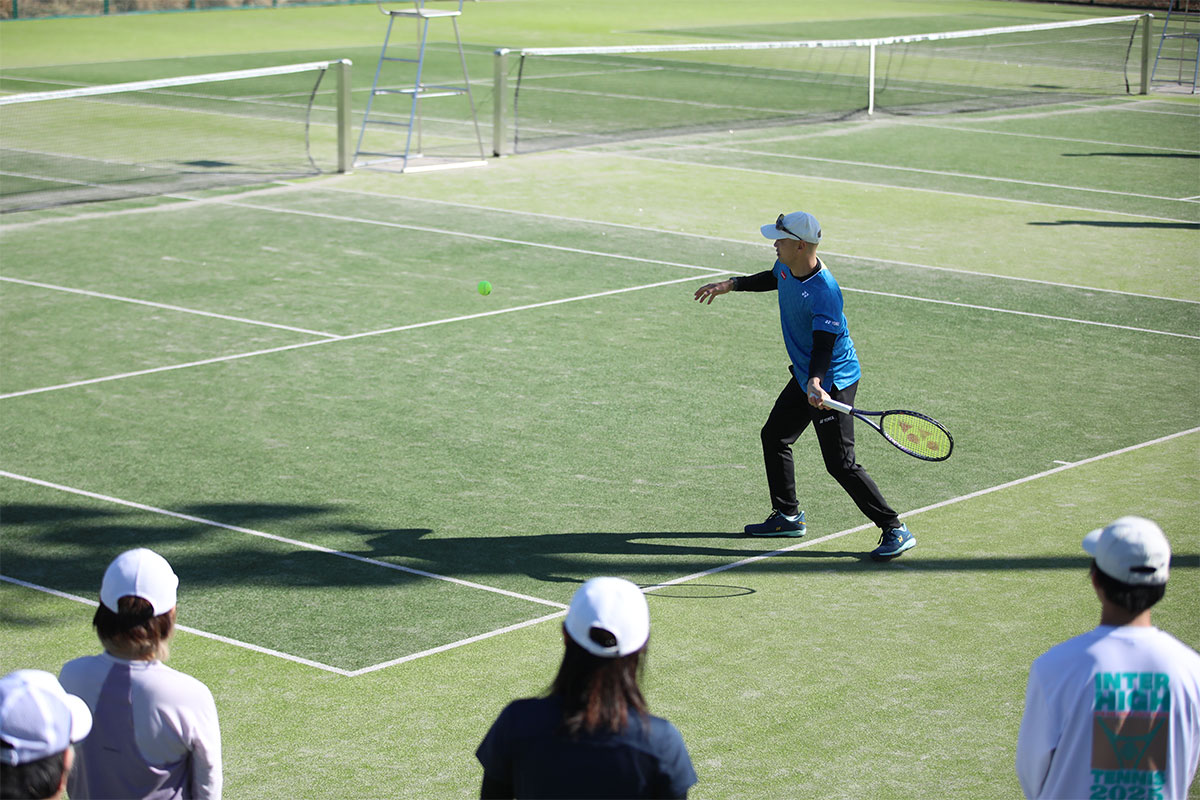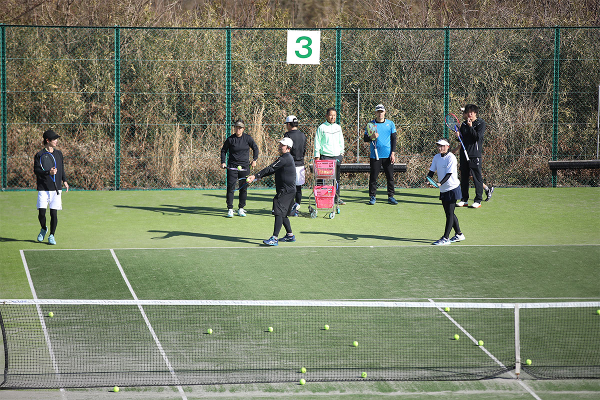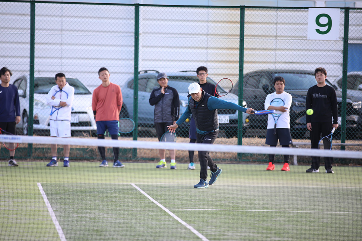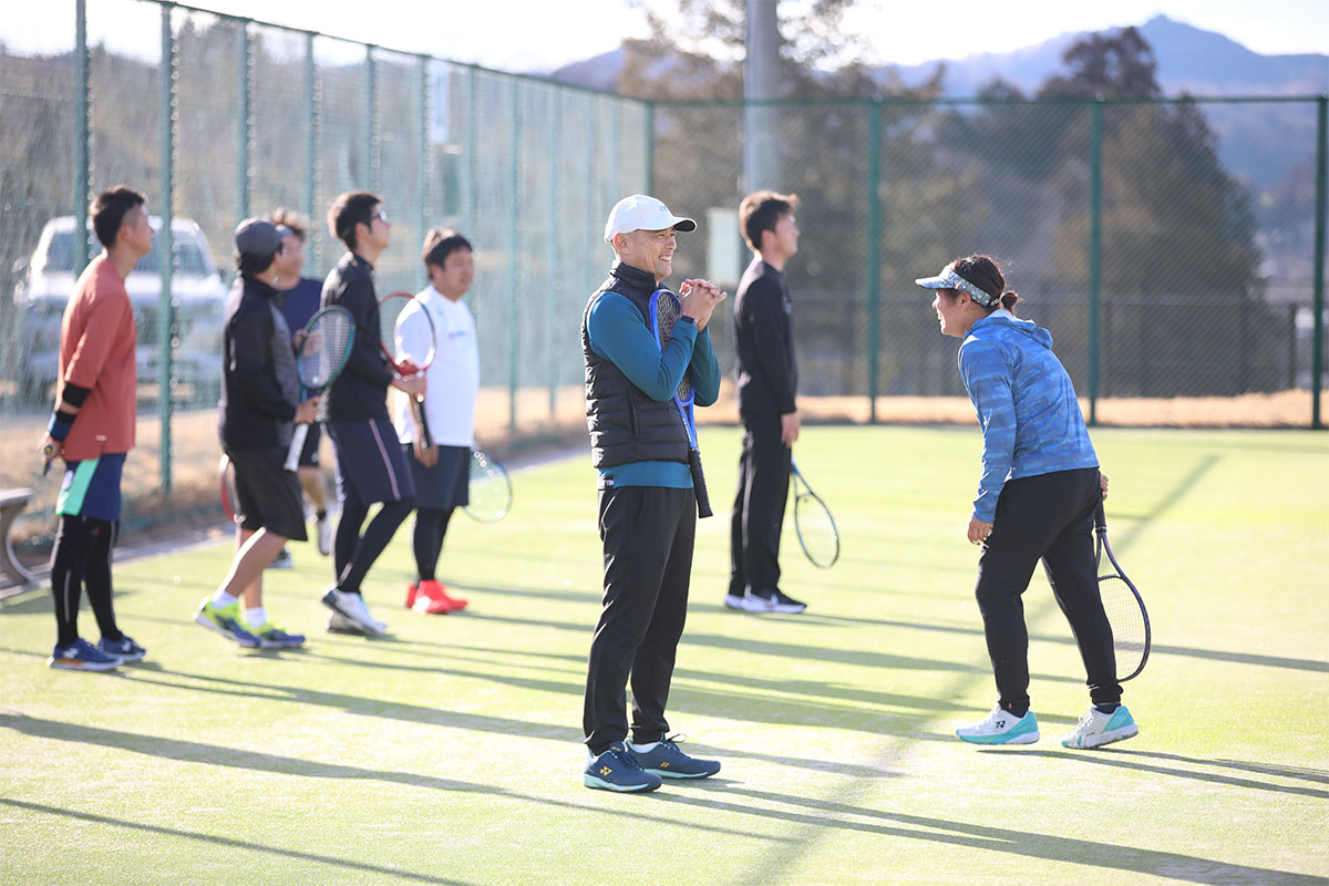 岩渕プロと交流をしながら、オンコートでのレッスンからビデオ映像を使用した座学講習までテニスのスキルアップに取り組みました。